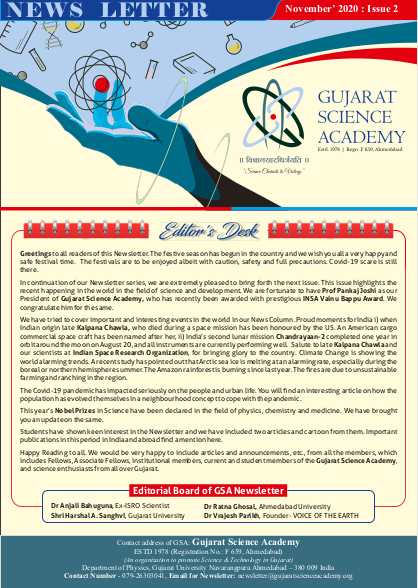 Gujarat Science Academy newsletter is published quarterly that includes interesting short articles and commentary on scientific and technological advancements happening across the globe. The newsletter features contributions from senior academicians, scientists from industrial sectors, early career researchers, school and college teachers and students at both graduate and undergraduate levels from different parts of Gujarat. The newsletter carries important information on career opportunities, upcoming webinars, interesting publications and workshops. Our aim is to reach pan India to showcase the diversity of research and teaching projects conducted by several schools, colleges, universities and research institutes from all over the world, and to enlighten the scientific community of our country.